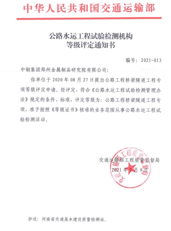 2021年2月9日,交通運(yùn)輸部工程質(zhì)量監(jiān)督局發(fā)布通知:經(jīng)評(píng)定,中鋼集團(tuán)鄭州金屬制品研究院有限公司符合《公路水運(yùn)工程試驗(yàn)檢測(cè)管理辦法》規(guī)定的條件、標(biāo)準(zhǔn),評(píng)定等級(jí)為:公路工程橋梁隧道工程專項(xiàng),準(zhǔn)予按照《等級(jí)證書(shū)》核準(zhǔn)的業(yè)務(wù)范圍從事公路水運(yùn)工程試驗(yàn)檢測(cè)活動(dòng)。