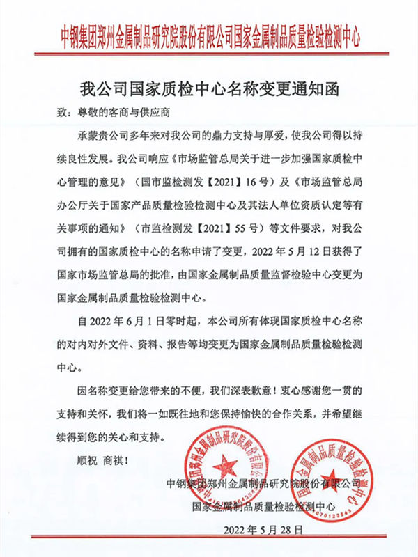 自2022年6月1日零時起,本公司所有體現(xiàn)國家質(zhì)檢中心名稱的對內(nèi)對外文件、資料、報告等均變更為國家金屬制品質(zhì)量檢驗檢測中心。